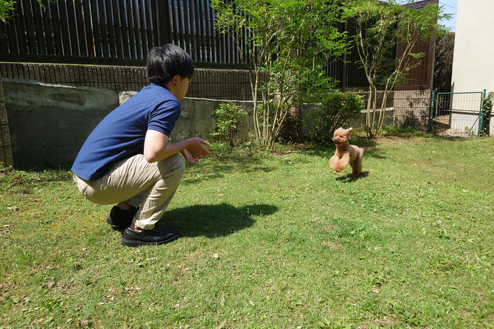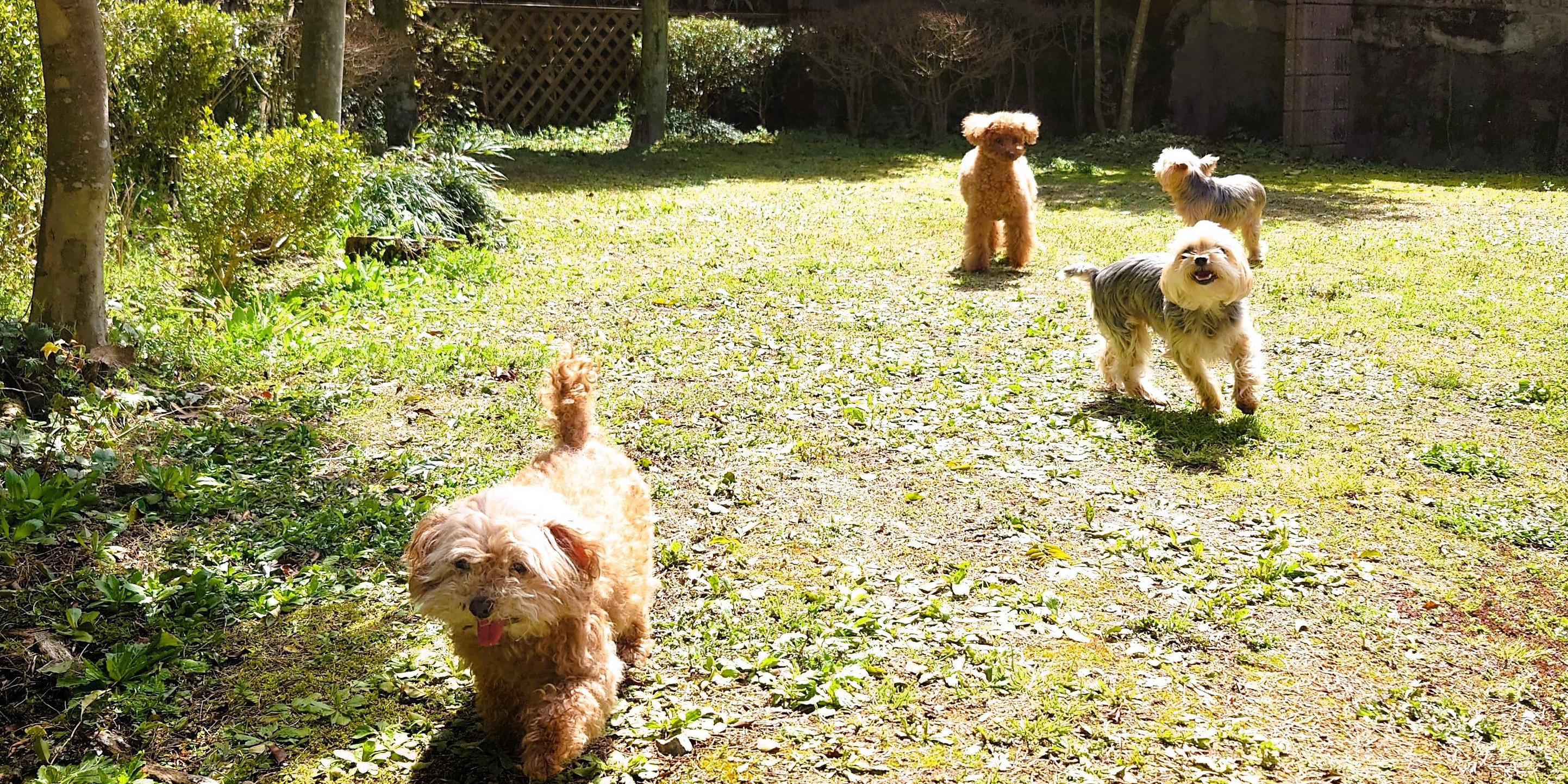 100㎡の天然芝のプライベートドッグランを貸し切りで走りまわったり、ボール投げしたり、安心して楽しくのびのびと過ごします。