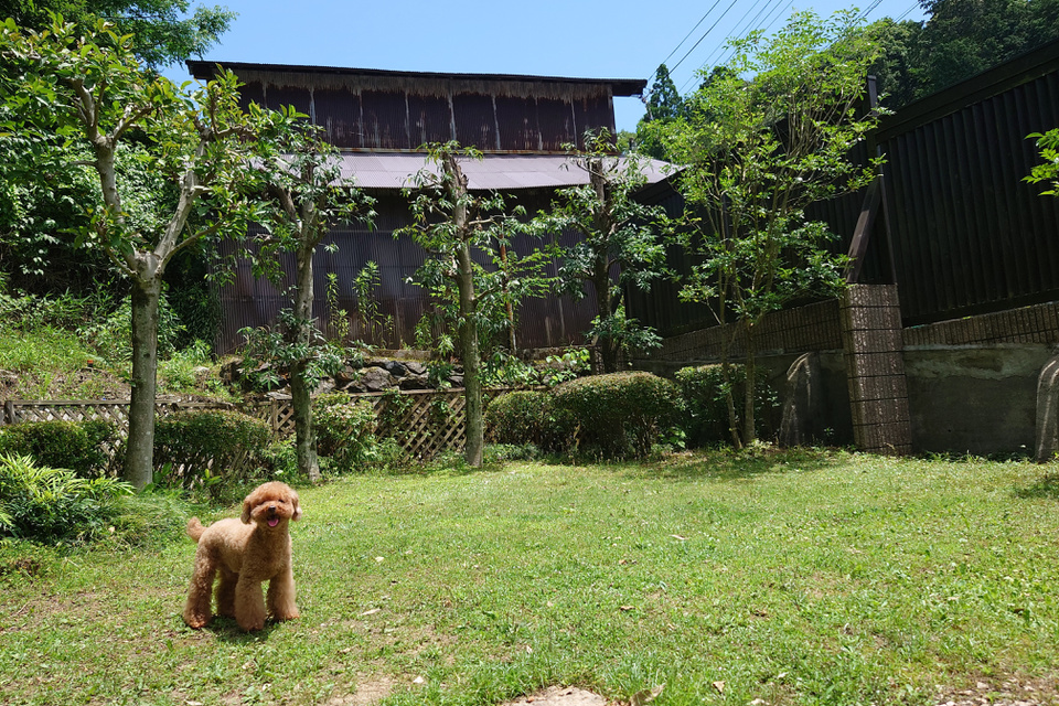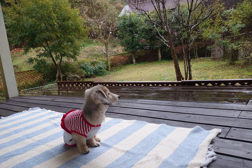 雨の日は屋根付きのウッドデッキにてのんびりしたり、好きなおもちゃで遊んだり。山からの新鮮な空気を吸ってリフレッシュしてもらいます♪